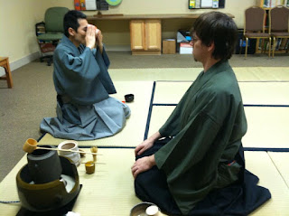After our lesson on koicha, we did some one-on-one practice. Josh and I are still beginners, so I practiced bon temae (tray ceremony, an abbreviated version of the regular usucha ceremony). I still need much work! Josh is better than me, so he practiced the full temae. I snapped a couple shots of him after I finished my temae.